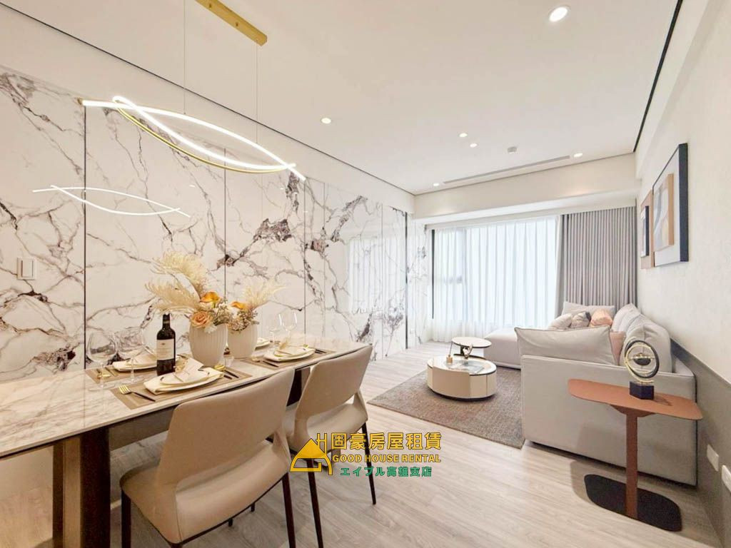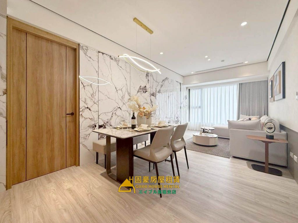 5.精緻的現代美學:全室採溫潤的地板搭配大理石紋系統牆,營造低調奢華的居家氛圍。頂烟廚具設備:配備Rinnai(林内)高級厨具與履藏式排油煙機,廚房空間整潔洗鏈,適合享受居家烹飪。