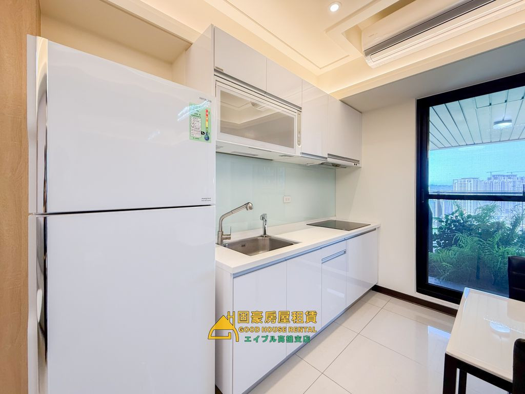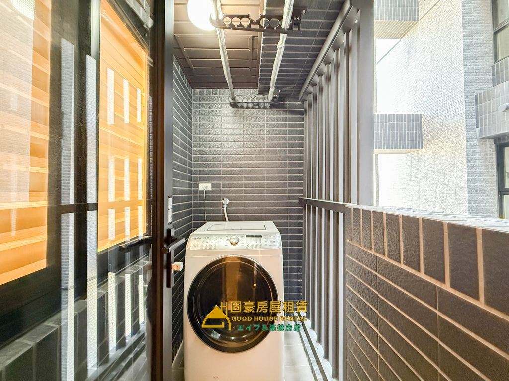 5.冷氣和冰箱皆用日立HITACHI,廚房安裝櫻花SAKURA瞬熱冷濾水設備,雙衛浴皆含KARAT凱樂免治馬桶,陽台放置洗脫烘的滾筒洗衣機,十分貼心
